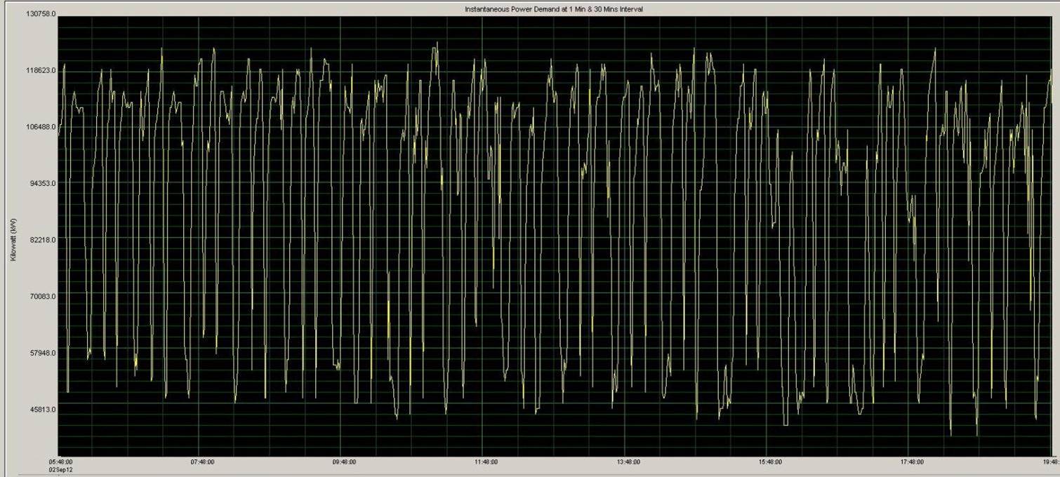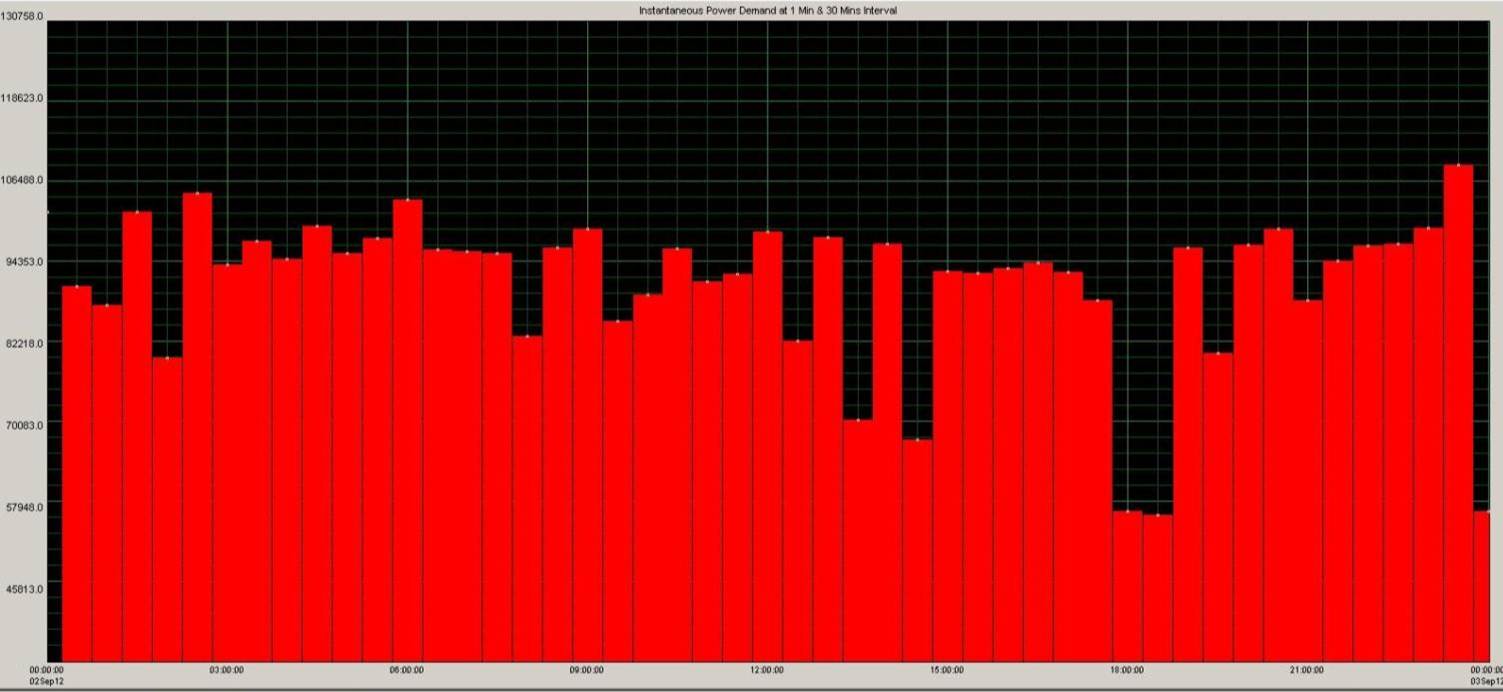 Here's an example of a poor usage of Maximum Demand (MD). The recorded MD has many peaks and throughs. TNB bills MD based on the highest peak recorded (from 0800hrs till 2200hrs) for the calendar month.